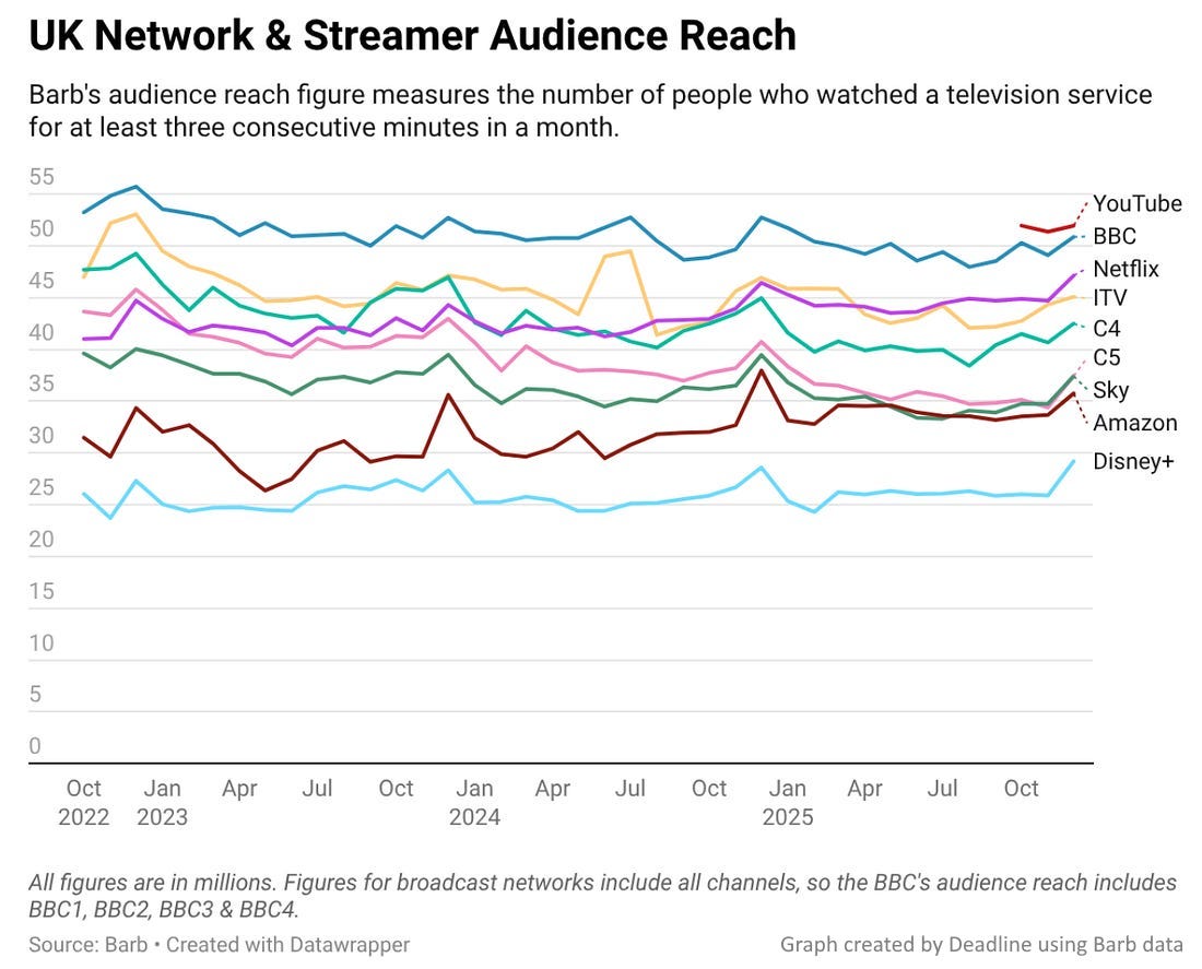 Between October and December 2025, YouTube reached more people in the UK than the BBC, when using a three-minute viewing window. This is the first time this has ever happened in the UK. The BBC still claims supremacy when looking at a 15-minute window. YouTube’s growth reflects the difficulty broadcasters have in competing with its unique business model.